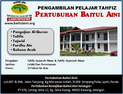 Pertubuhan Baitul Aini Kuang Selangor Malaysia. Maahad Tahfiz Baitul Aini CIMB 8602252962. Kuala Pari Hilir 30100 Ipoh PENANG.